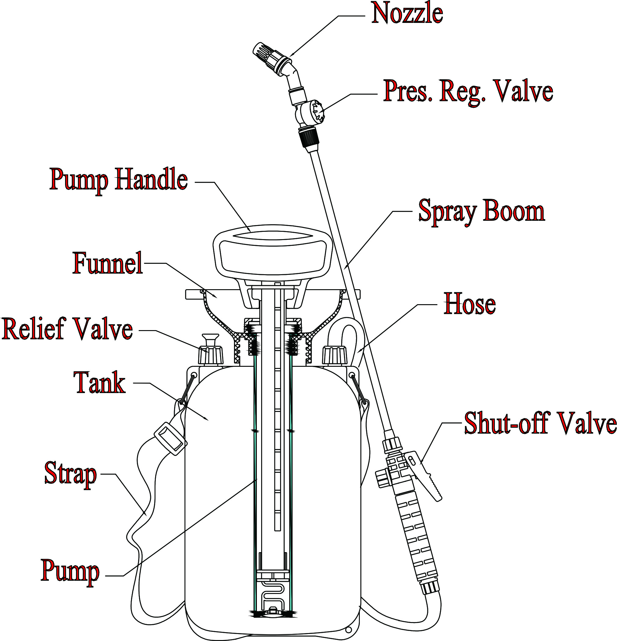Composto por um tanque, uma unidade de bomba (cilindro, manopla, pistão etc., conjunto de pulverização (mangueira, fechamento, lança de pulverização e bico), válvula de alívio, cinta, etc.